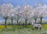 2014Schaap in boomgaard met bloesem.